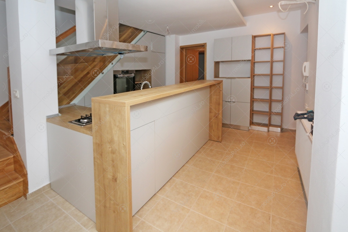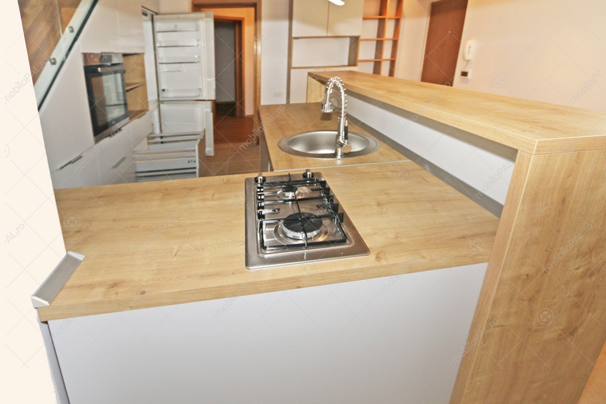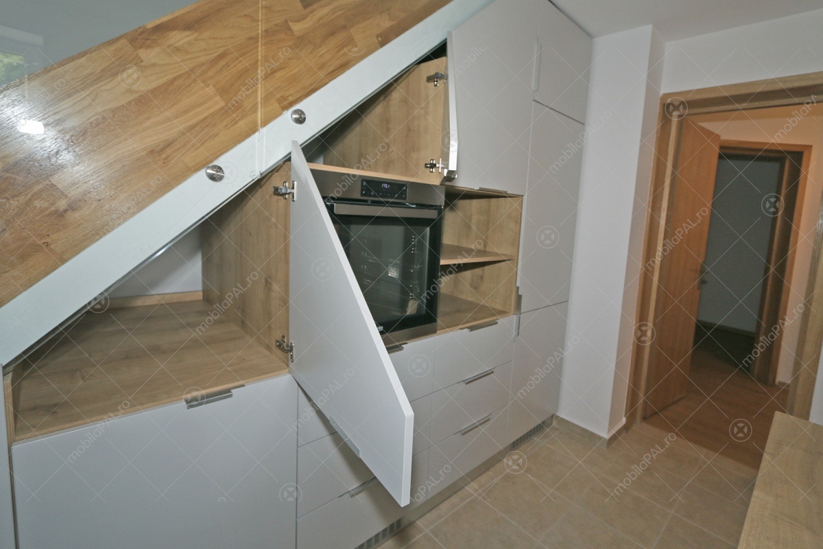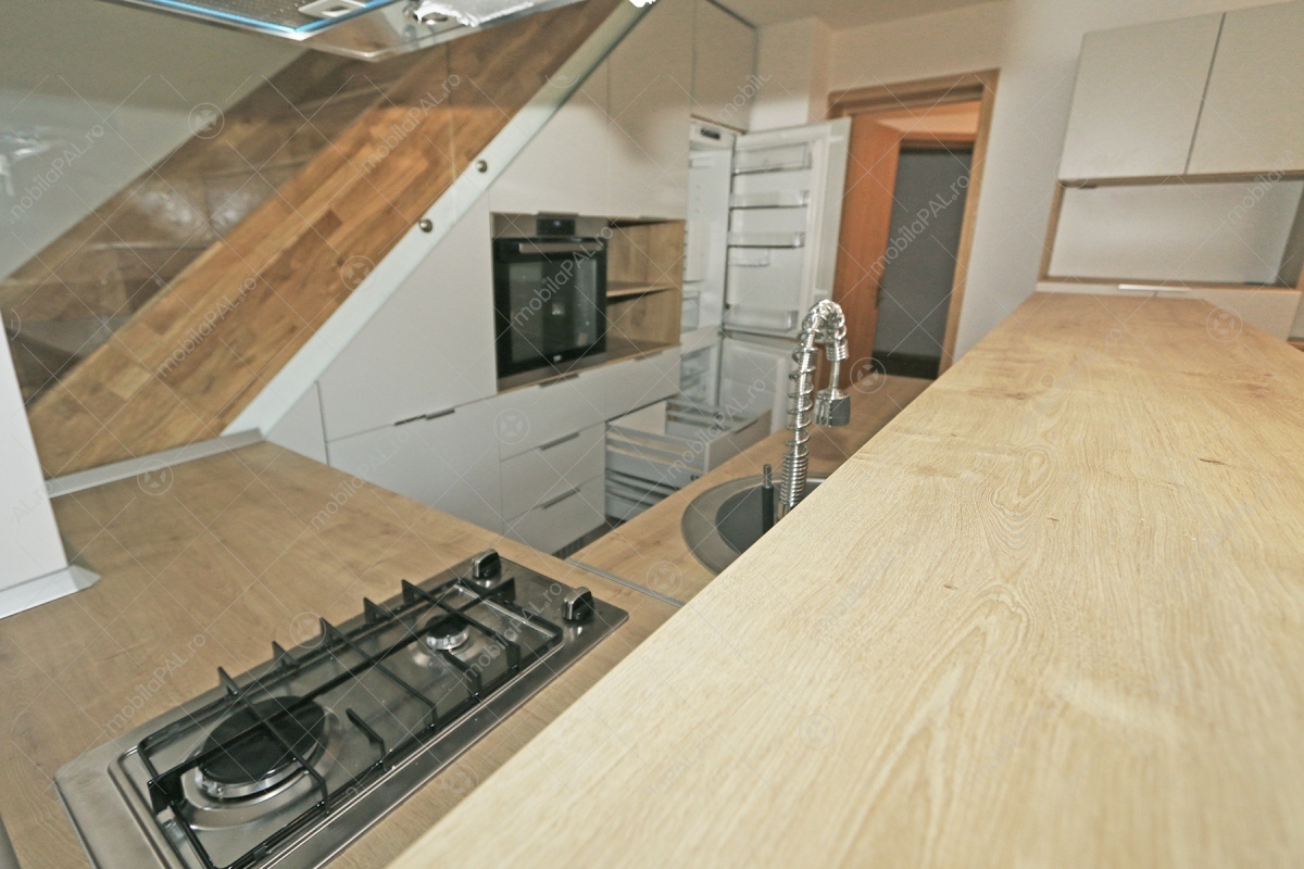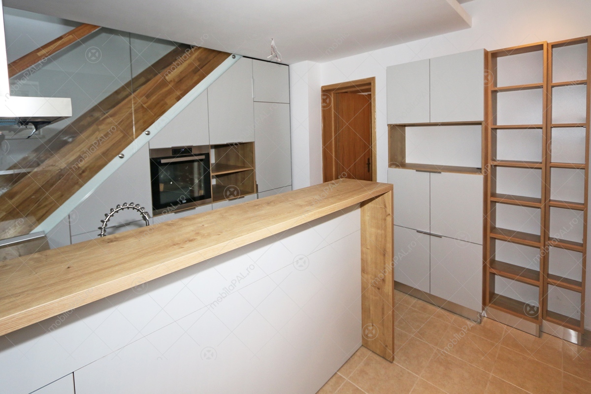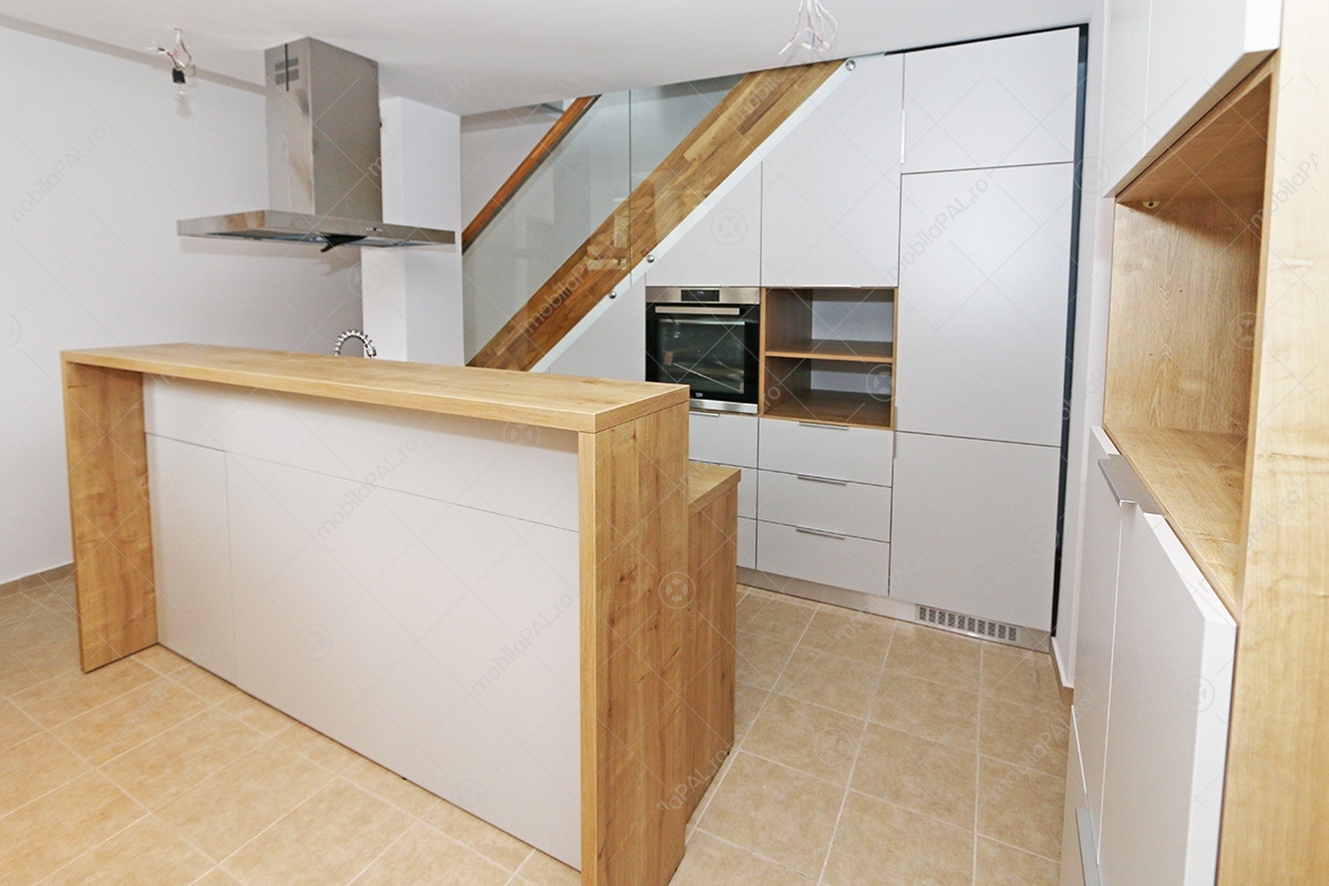 Bucatarie bar cu peninsula si incastrabile sub scara.